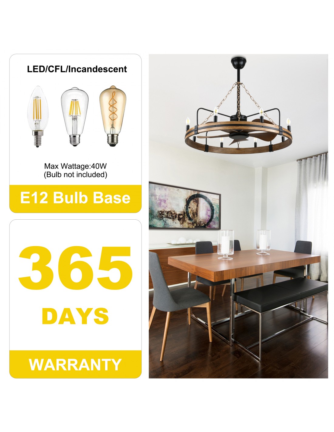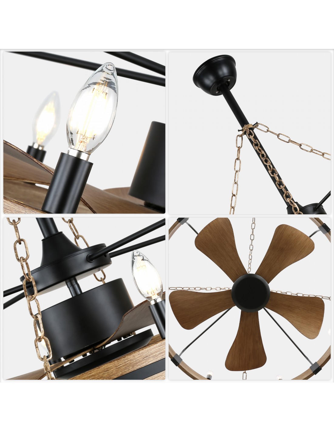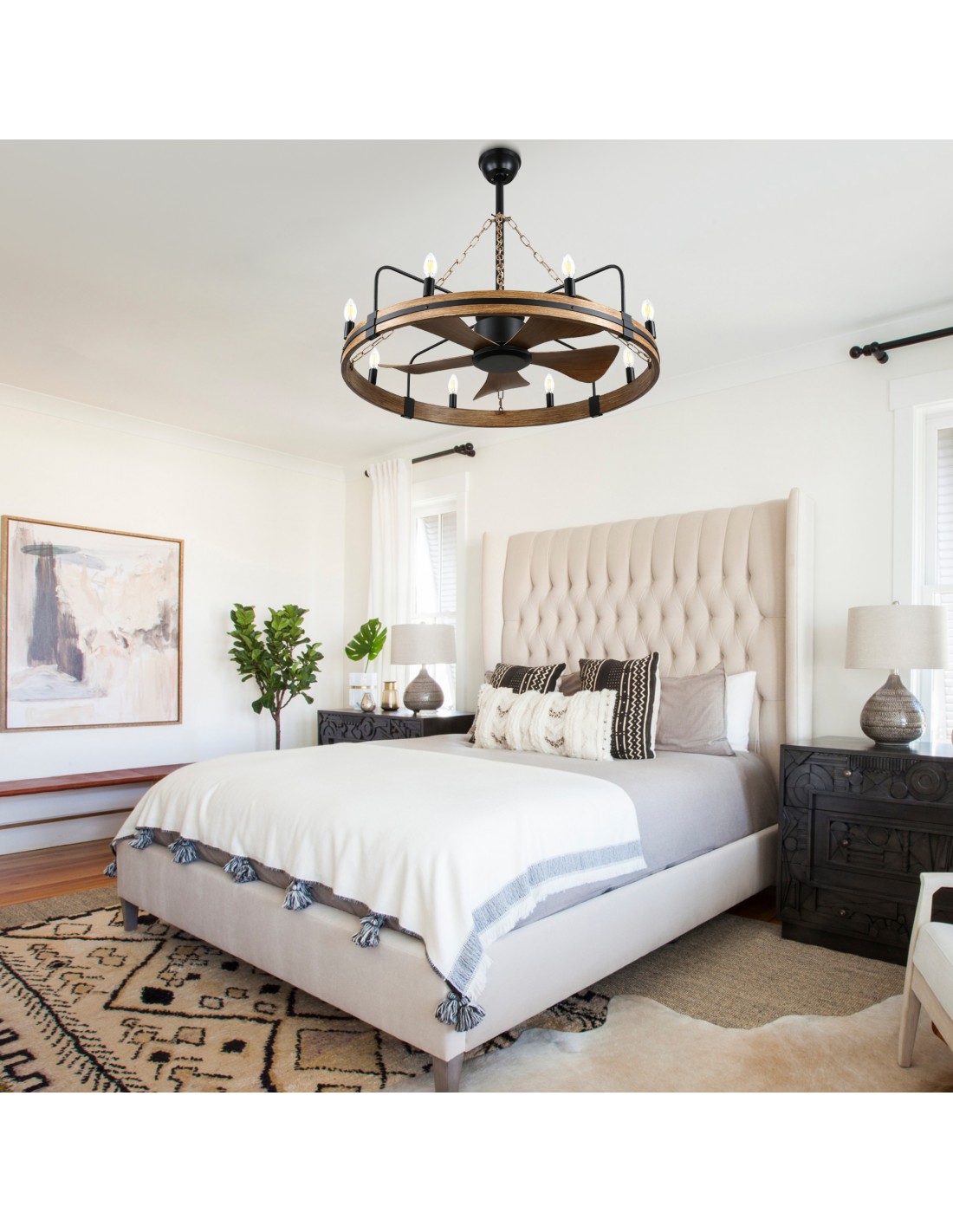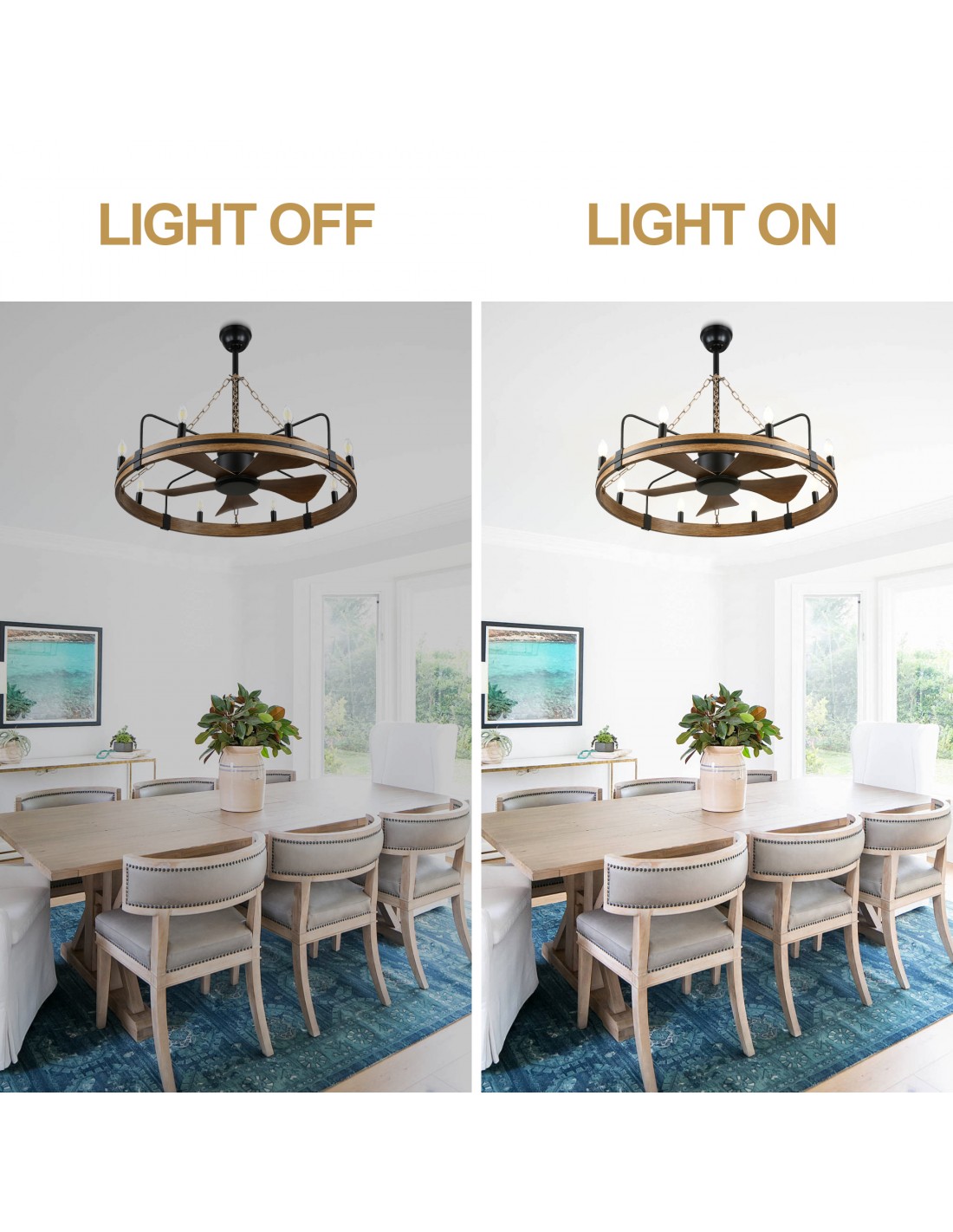 Designed with an authentic wagon wheel chandelier structure, this fan features a natural wood grain finish paired with sturdy matte black metal accents, creating a striking vintage focal point. The 8 candle-style light bases emit warm, diffused light, while the enclosed 5 wood grain blades deliver powerful, quiet airflow. Whether you’re updating a farmhouse dining room, a rustic living room, or an industrial foyer, this wagon wheel ceiling fan with light is the perfect finishing touch.