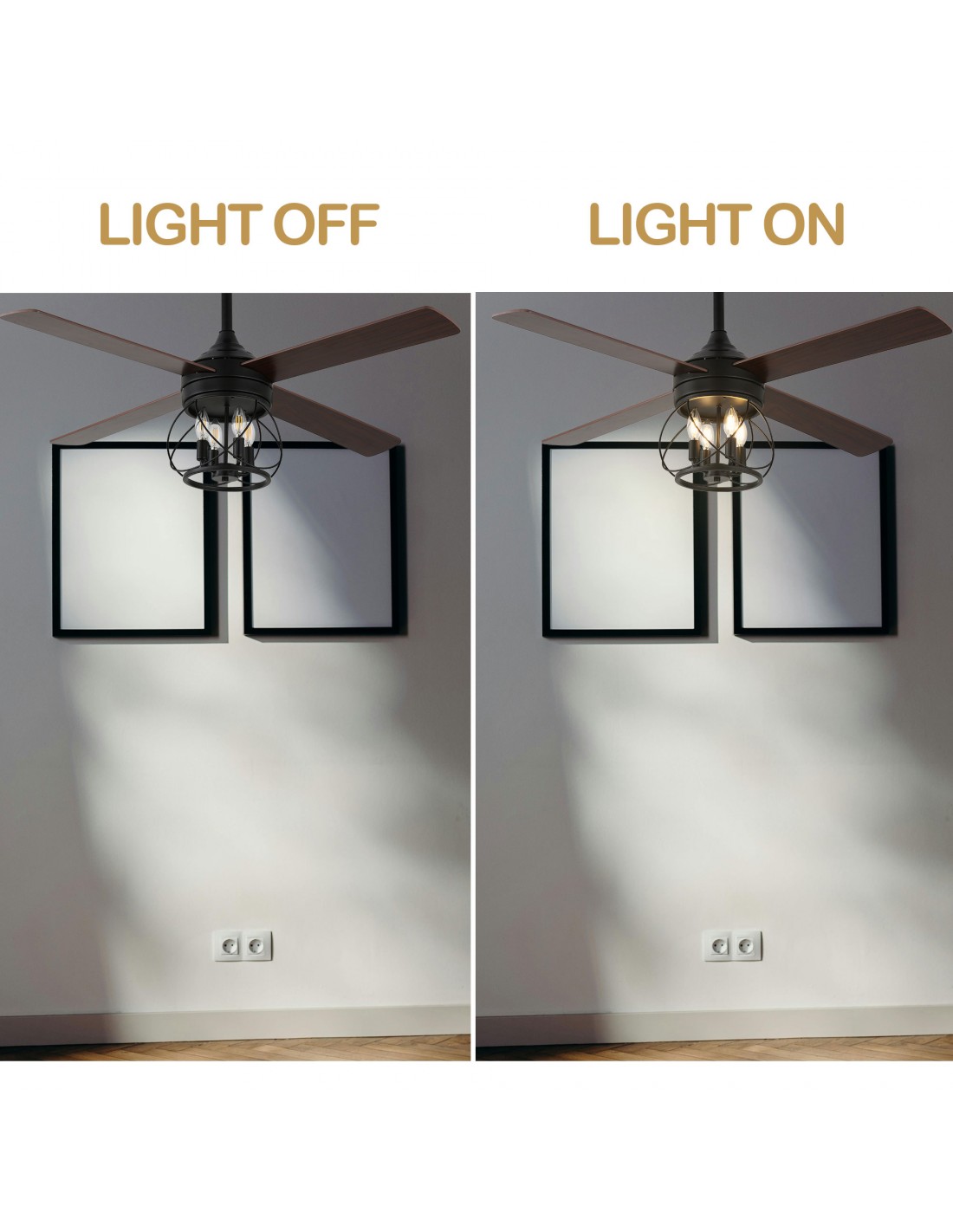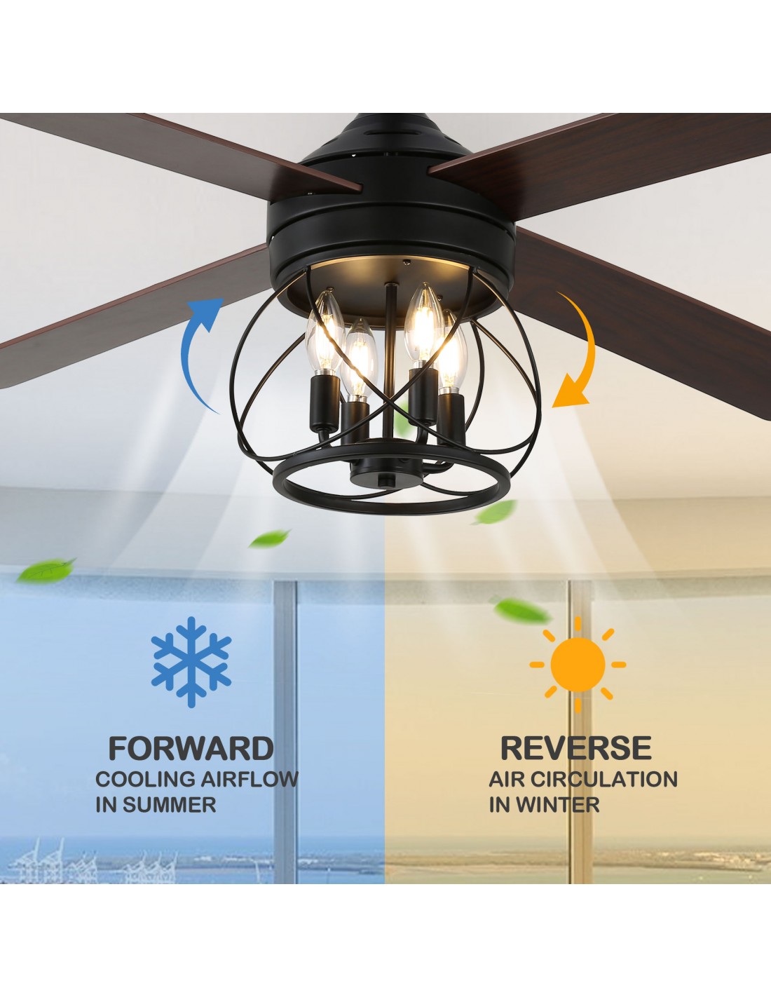 Elegant Design: Black iron lampshade frame combined with wooden fan blades shows elegant design style and adds flavor to the room.