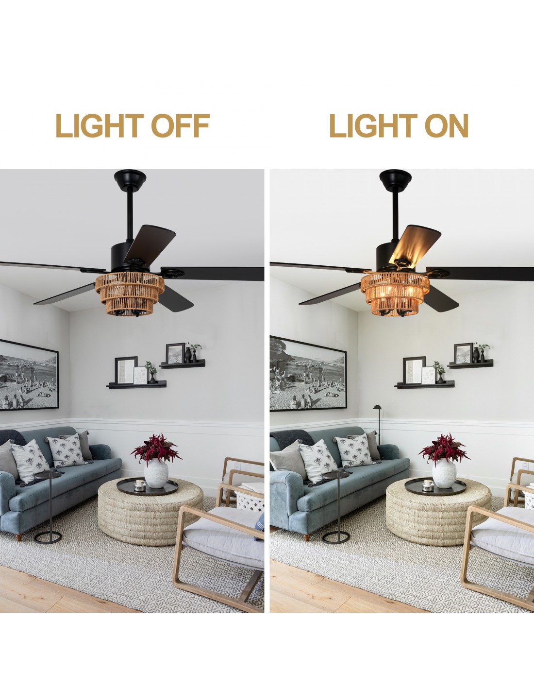 Natural Elegance: Handwoven wicker shade paired with five premium plywood blades creates a warm, organic aesthetic.
