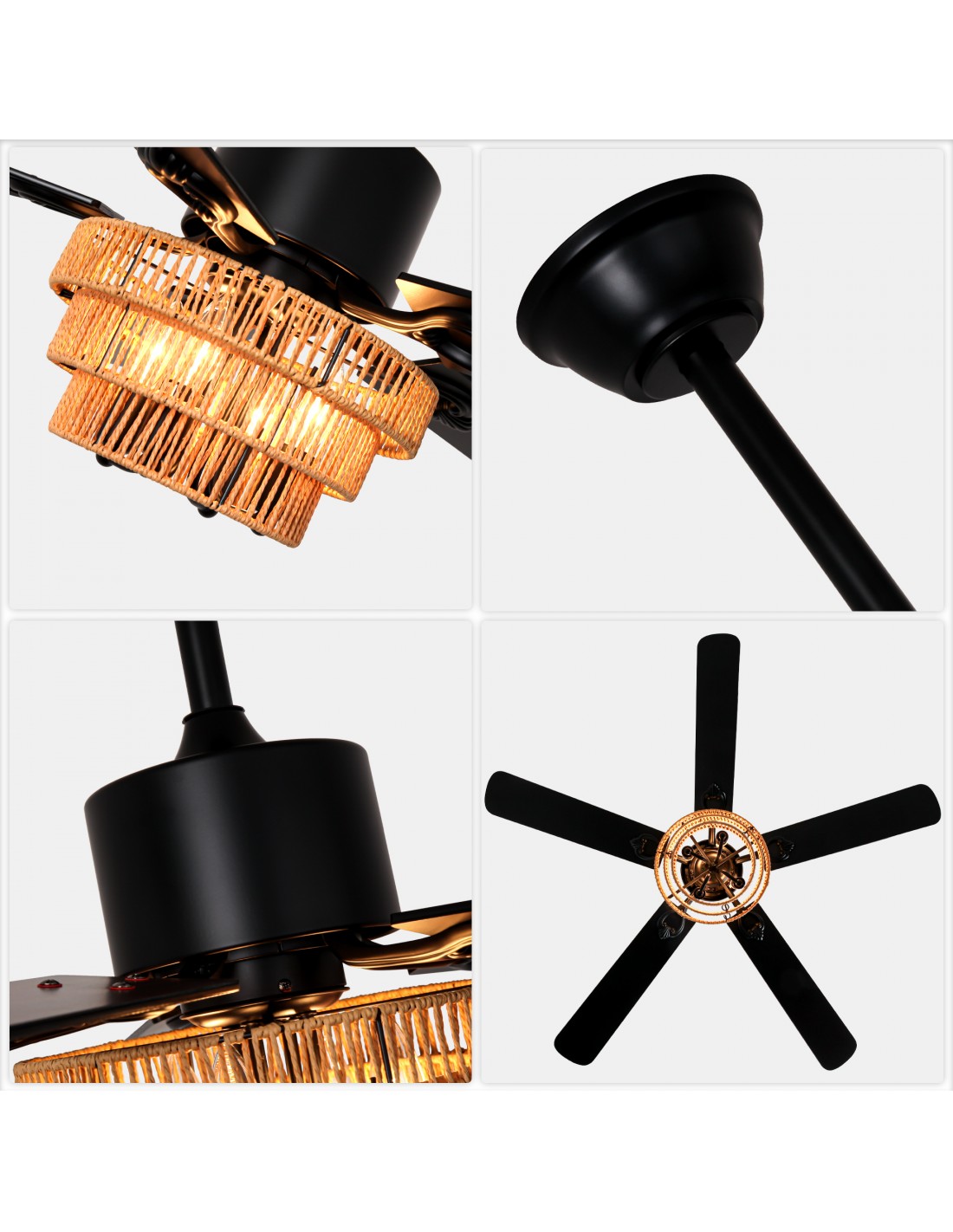 Elevate your space with this sophisticated 52-inch black ceiling fan featuring five blades and an elegant wicker lampshade. The advanced DC motor delivers powerful 5200 CFM airflow while operating at a whisper-quiet 35dB. Enjoy complete climate control with 6-speed settings, 2/4-hour timer, and reversible function - all conveniently managed through the memory-enabled remote control. Includes two downrods (11.8" and 5.9") for flexible installation. ETL certified with 1-year warranty for peace of mind.