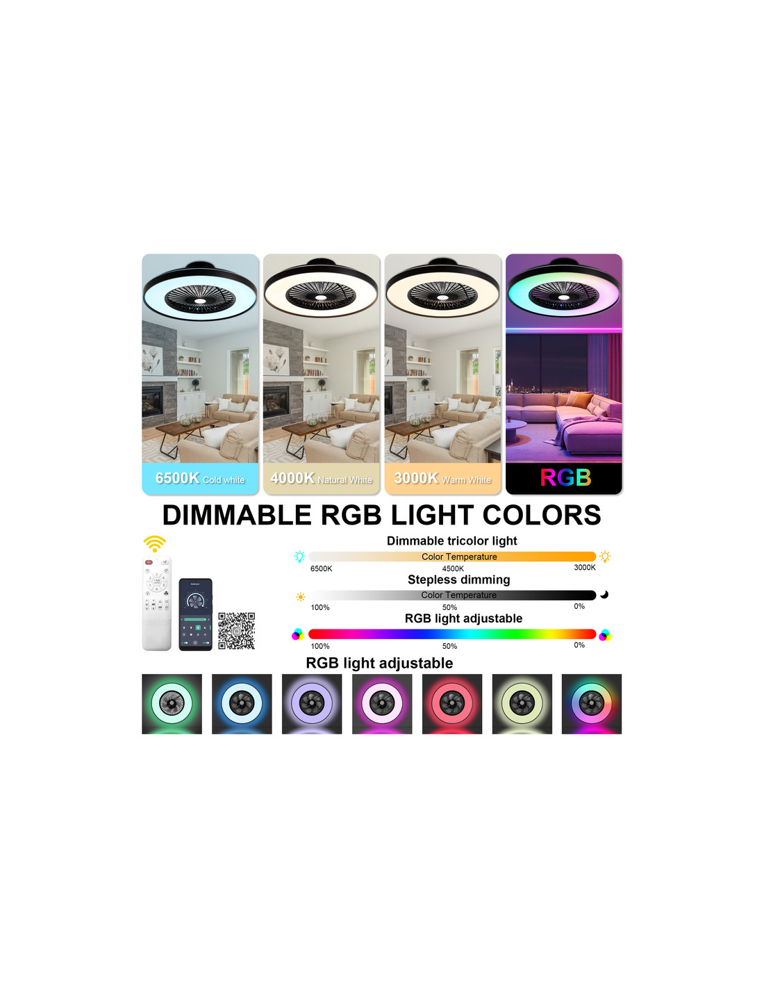 Colorful RGB Lighting: Choose from a variety of lighting colors to create a personalized ambiance for different occasions and moods. Seamlessly switch between dynamic RGB effects and adjustable LED light (3000K/4500K/6000K) to match any activity or time of day. This ceiling fan doubles as a gentle night light, providing soft illumination for nighttime comfort without disrupting sleep.