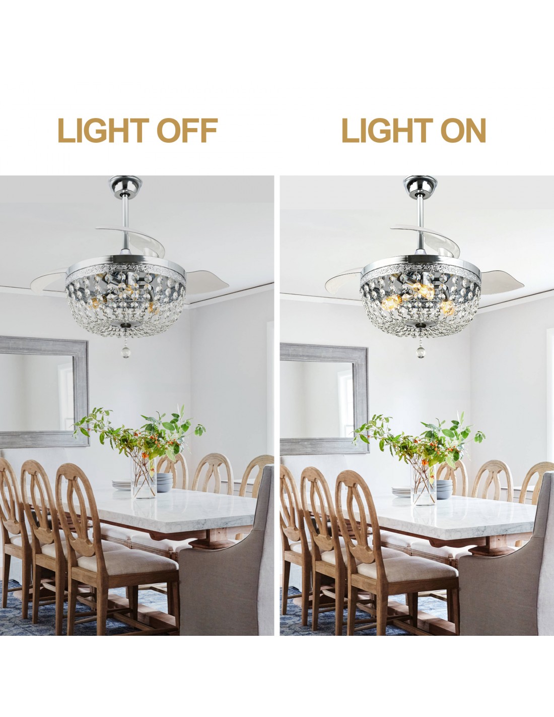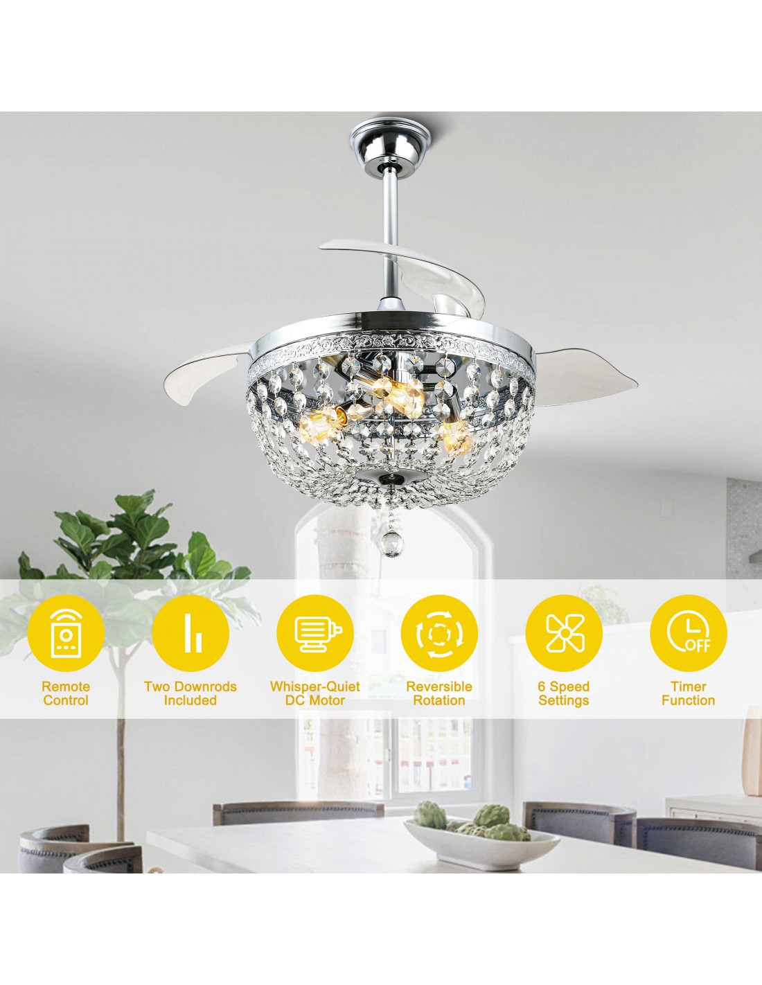 Elevate your space with this exquisite crystal ceiling fan with light, where industrial charm meets timeless elegance. Crafted from premium wrought iron and adorned with cascading crystal strands, this fixture serves as both a statement piece and a functional marvel. The fan features three transparent acrylic blades that rotate with whisper-quiet precision, powered by an advanced DC motor (6-speed adjustable). Includes two adjustable downrods (9.8" and 4.9") for customized height, while the reversible function adapts to seasons-downdraft for summer cooling or updraft for winter air circulation.