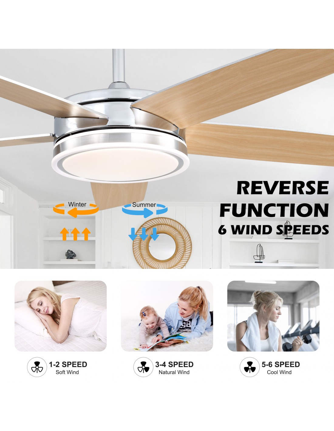 Reverse Function: Switch the fan's rotation direction to circulate air efficiently and maintain comfort throughout the year.