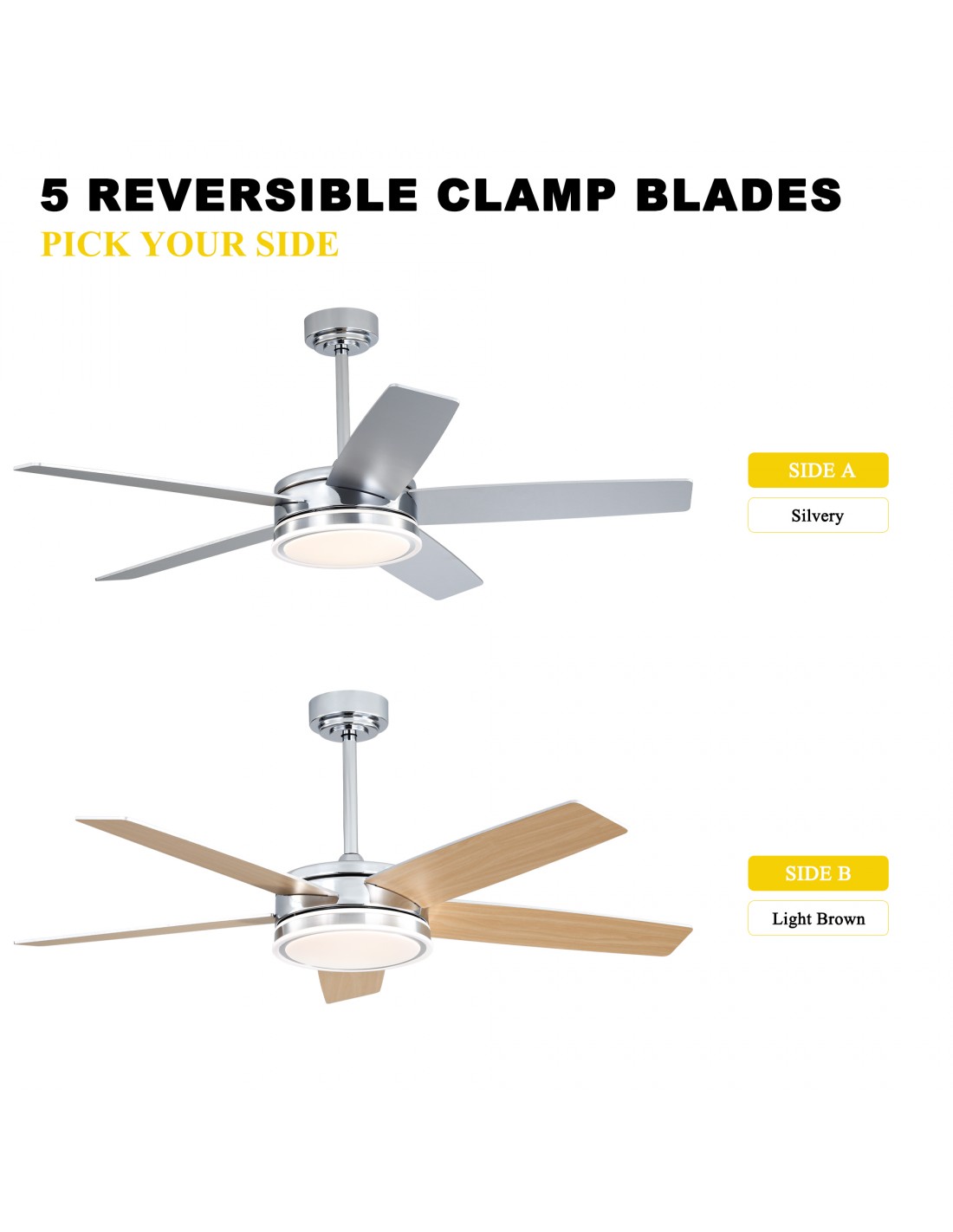 Sleek Design: Five blade panels and a minimalist round white light fixture for a contemporary and elegant look.
