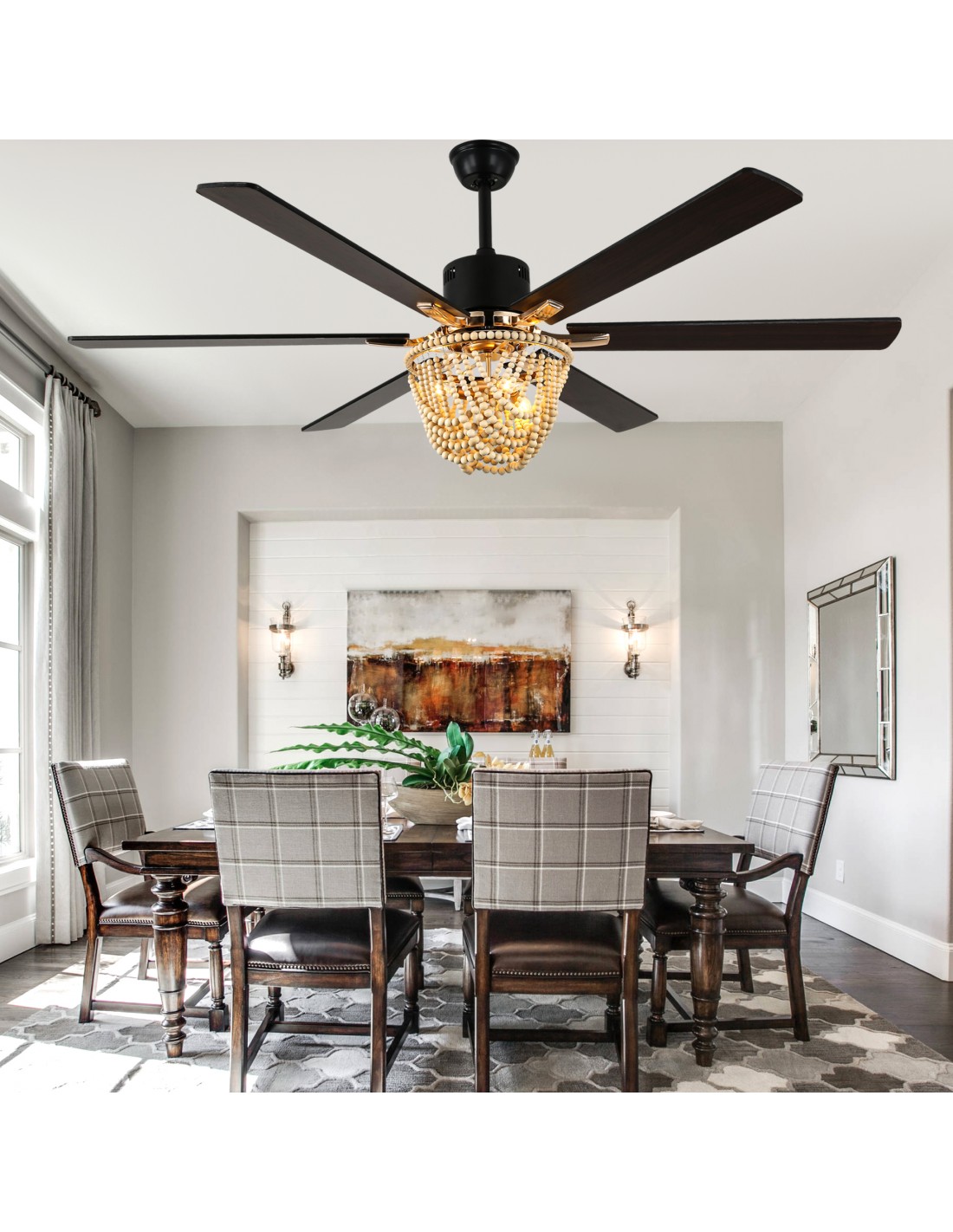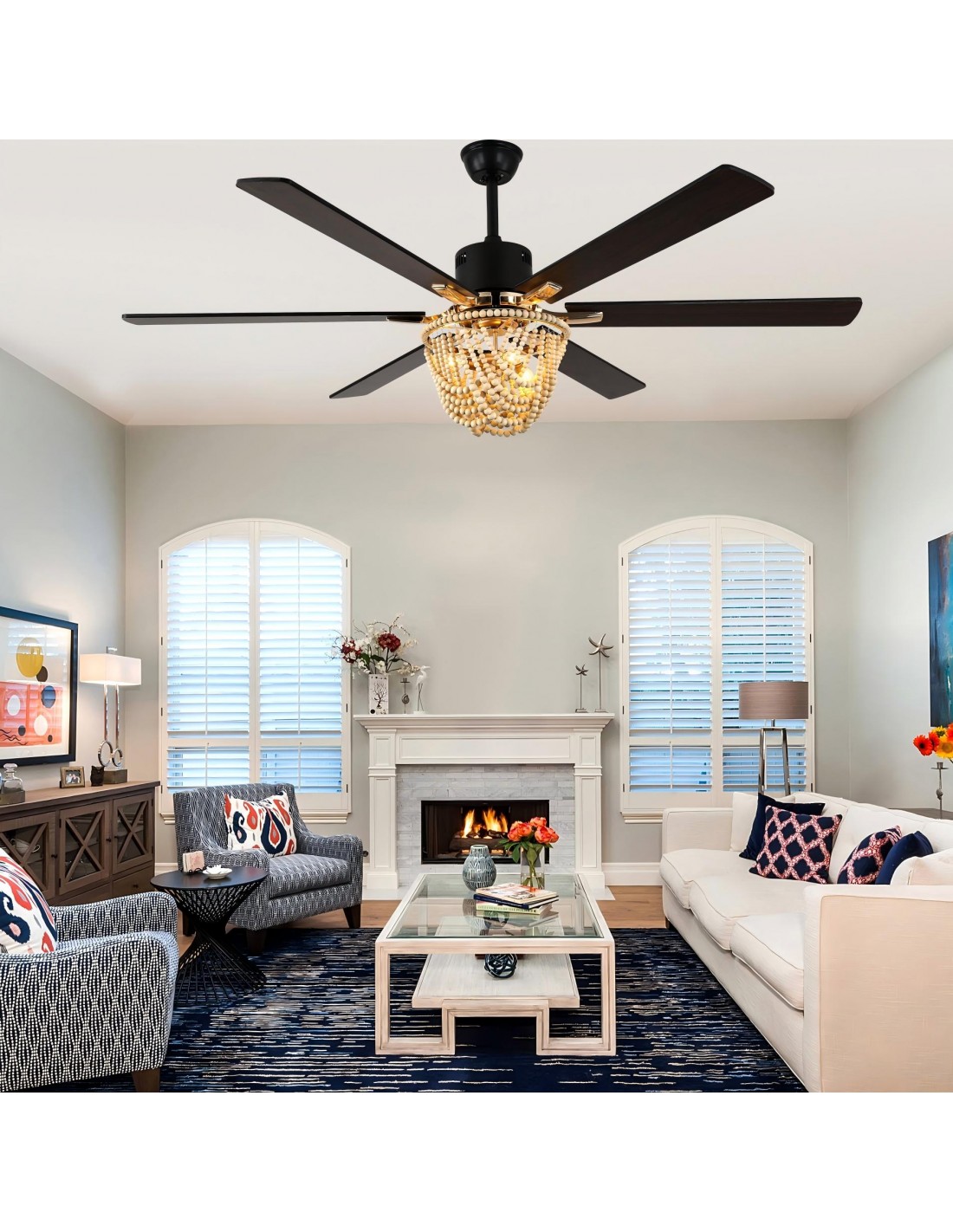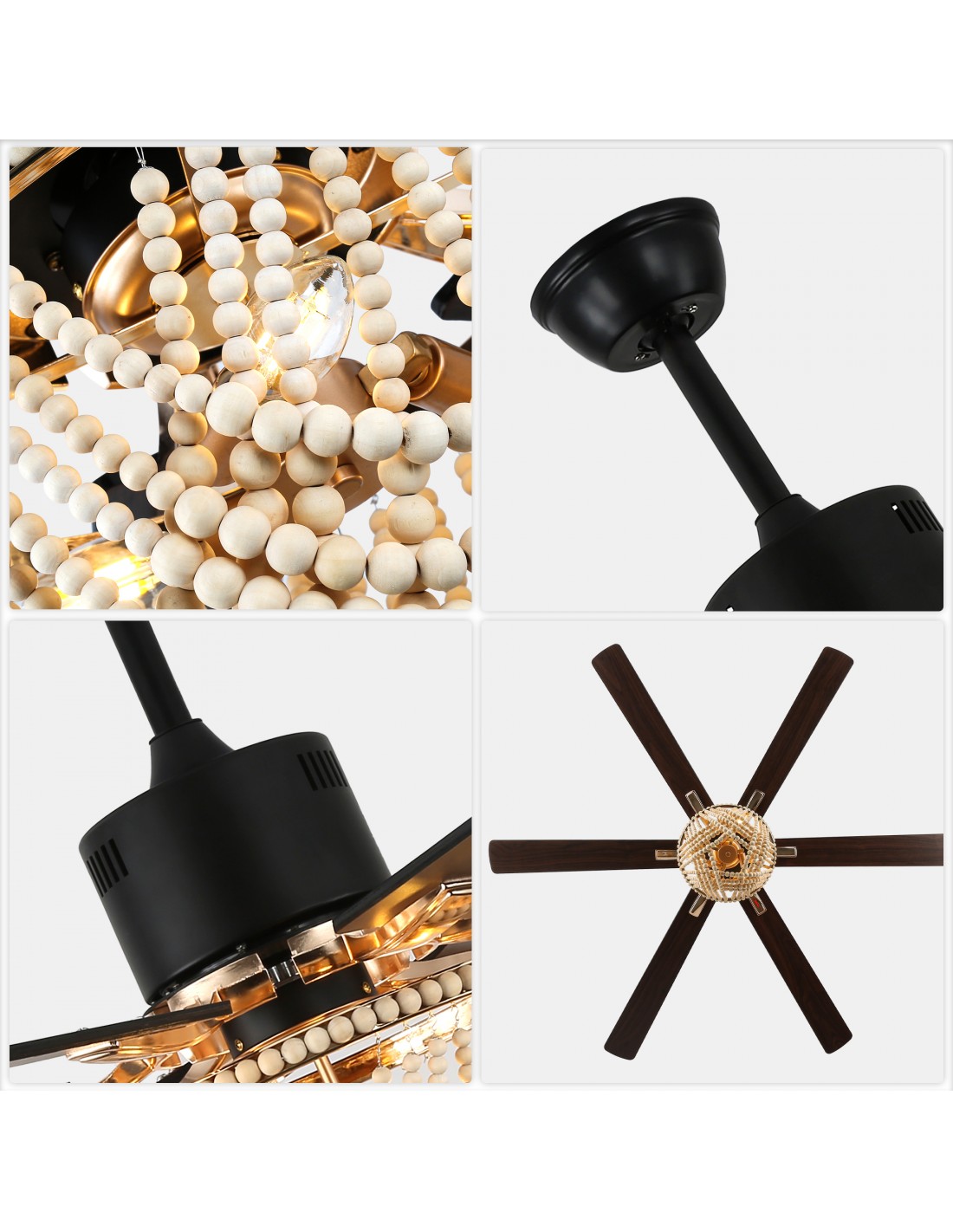 Introducing the Matte Black 65-Inch Ceiling Fan Light, featuring six sleek blade fan design and a bottom light shade crafted from natural wood beads. This exquisite combination of modern design and natural elements creates a striking aesthetic in any room. The high-performance DC motor delivers powerful 6000 CFM airflow while operating at a whisper-quiet 35dB. Enjoy complete climate control with 6-speed settings, 2/4-hour timer, and reversible function - all conveniently managed through the remote control. Includes two downrods (5.9" and 11.8") for flexible installation.