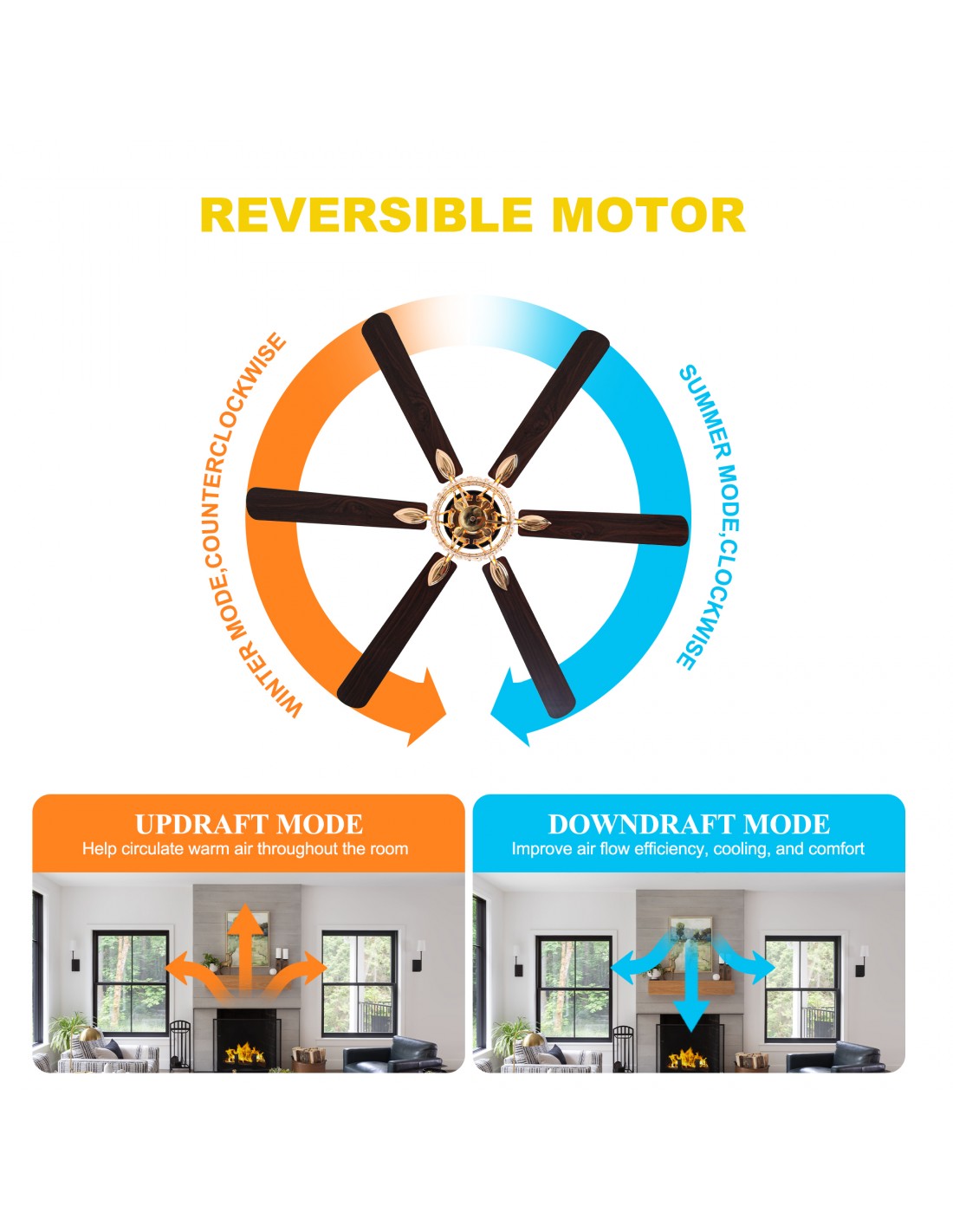 • Reverse Function: Enjoy year-round comfort with the reversible motor, offering cool breezes in summer and circulating warm air in winter.