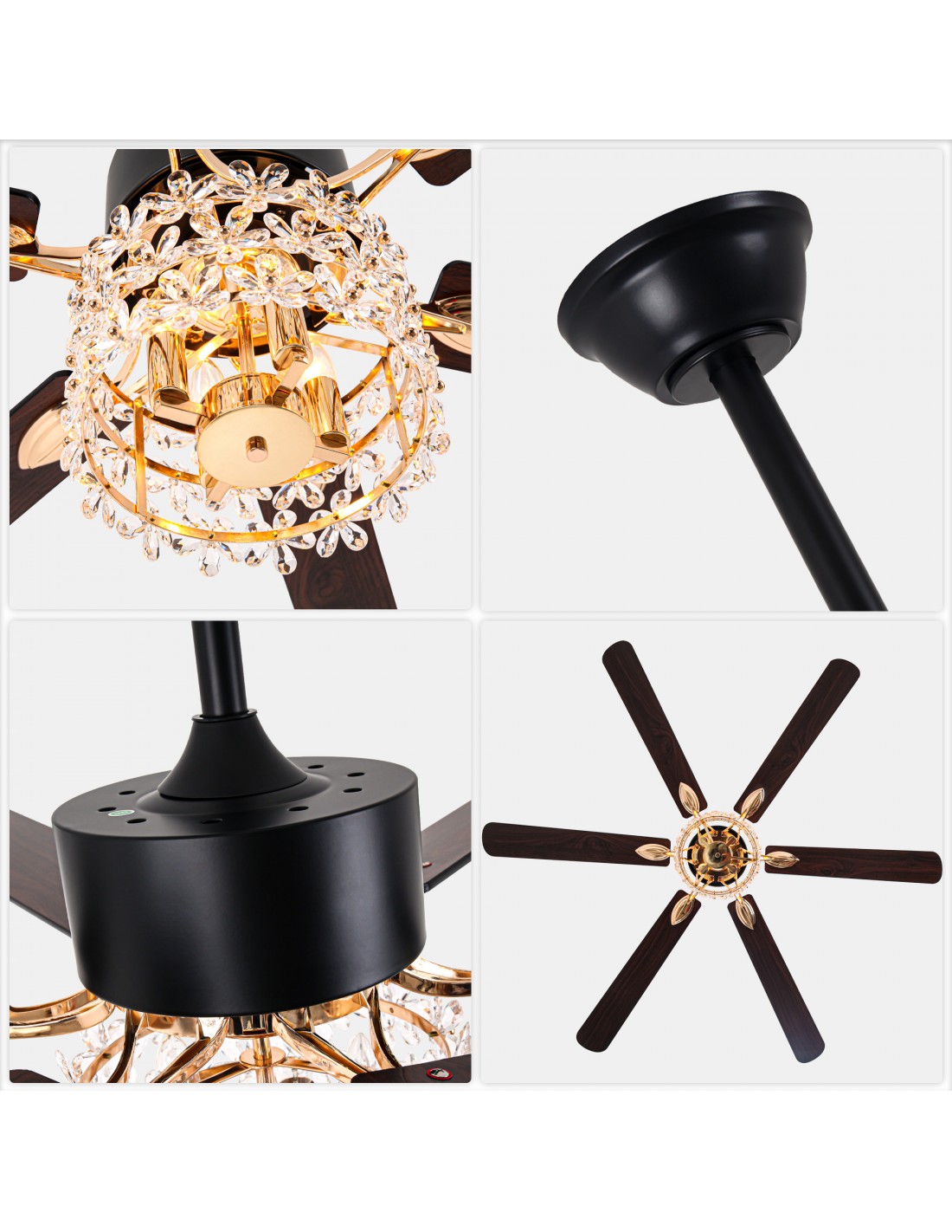Introducing our stunning 65-inch ceiling fan, designed to bring sophistication and style to your living space. Featuring six blade fan design and a unique light shade made of crystal petals, this piece adds a touch of elegance to any room. The advanced DC motor delivers powerful 6000 CFM airflow while operating at a whisper-quiet 35dB. Enjoy customizable comfort with 6-speed settings, 2/4-hour timer, and reversible function - all conveniently controlled through the remote. Includes two downrods (5.9" and 11.8") for flexible installation.