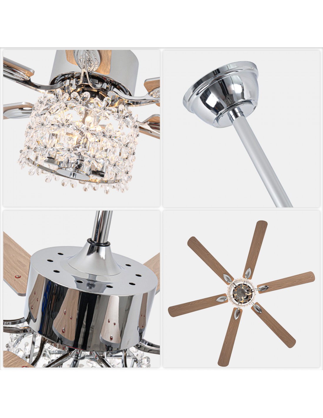 Introducing our stunning 65-inch ceiling fan, designed to bring sophistication and style to your living space. Featuring six blade fan design and a unique light shade made of crystal petals, this piece adds a touch of elegance to any room. The advanced DC motor delivers powerful 6000 CFM airflow while operating at a whisper-quiet 35dB. Enjoy customizable comfort with 6-speed settings, 2/4-hour timer, and reversible function - all conveniently controlled through the remote. Includes two downrods (5.9" and 11.8") for flexible installation.