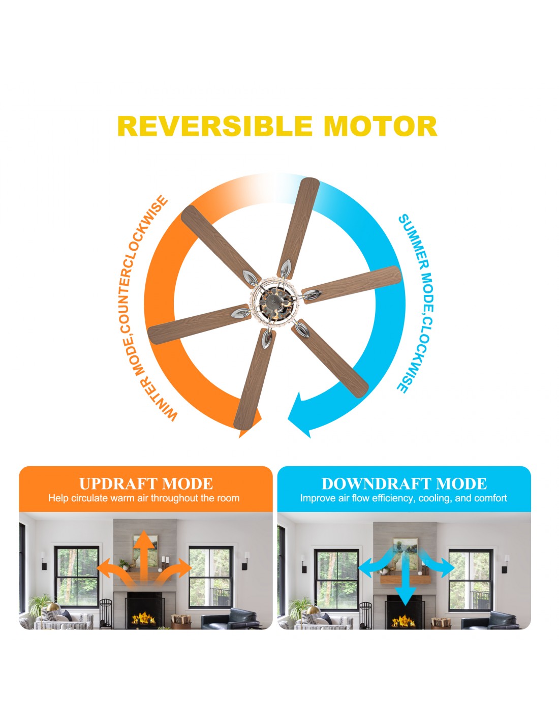 Reverse Function: Enjoy year-round comfort with the reversible motor, offering cool breezes in summer and circulating warm air in winter.