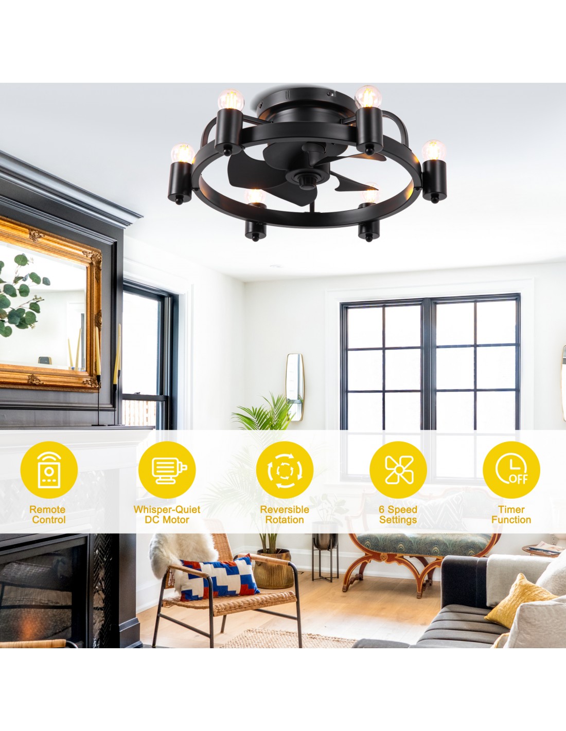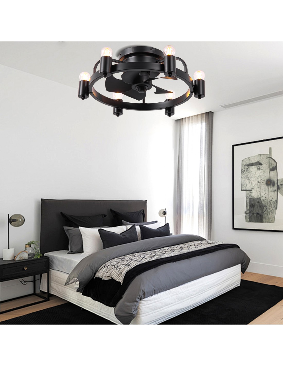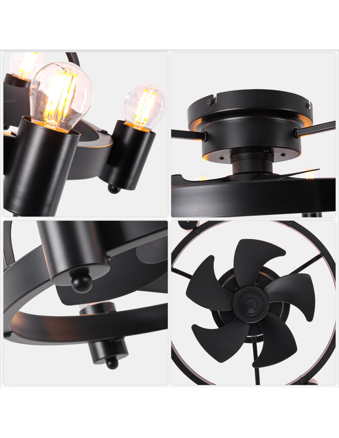 Elevate your space with this 20-inch black flush mount ceiling fan, a perfect blend of industrial charm and modern functionality. This ceiling fan light features a minimalist design with a unique touch, six Edison light bulbs encased in a circular iron frame, adding a touch of industrial charm to your room. Elevate your home decor with this versatile and stylish lighting solution.