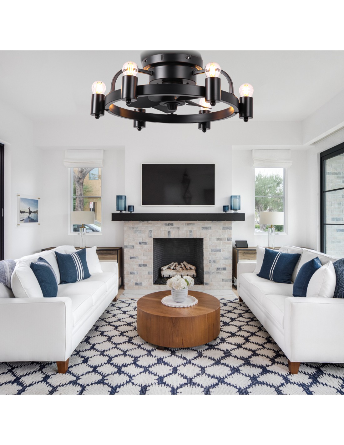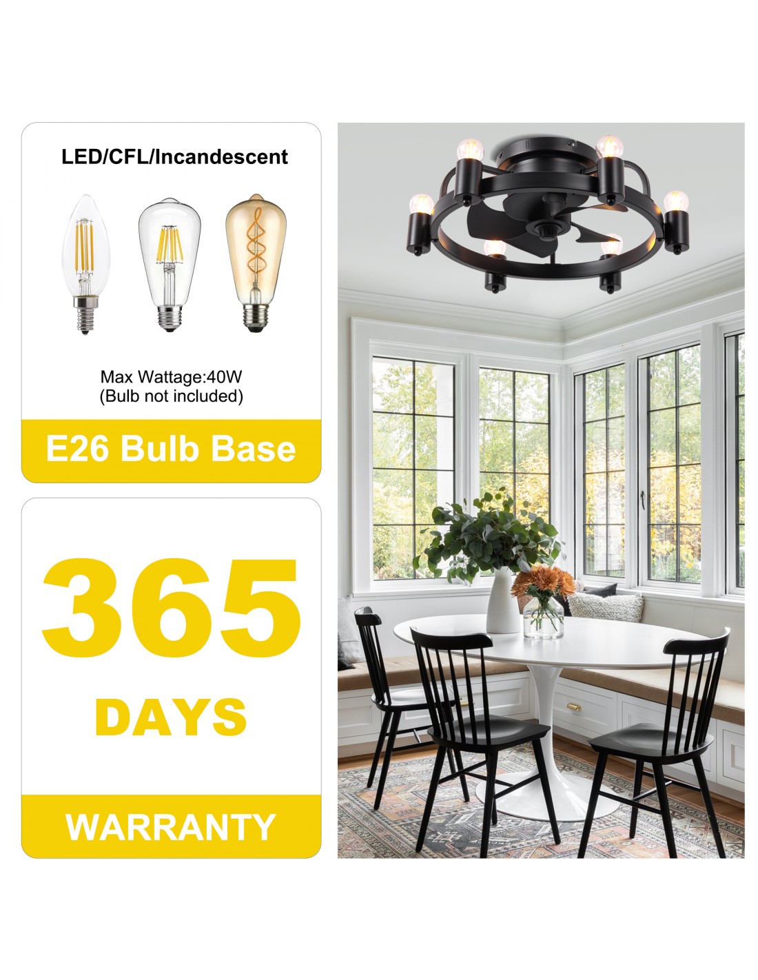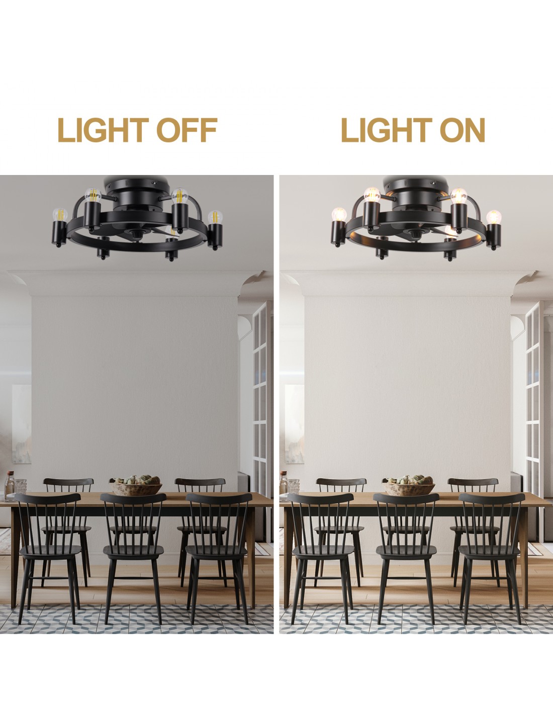 Elevate your space with this 20-inch black flush mount ceiling fan, a perfect blend of industrial charm and modern functionality. This ceiling fan light features a minimalist design with a unique touch, six Edison light bulbs encased in a circular iron frame, adding a touch of industrial charm to your room. Elevate your home decor with this versatile and stylish lighting solution.