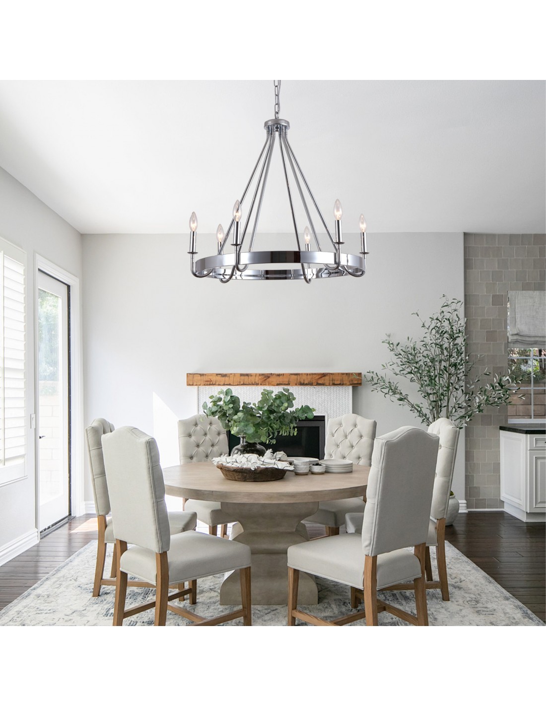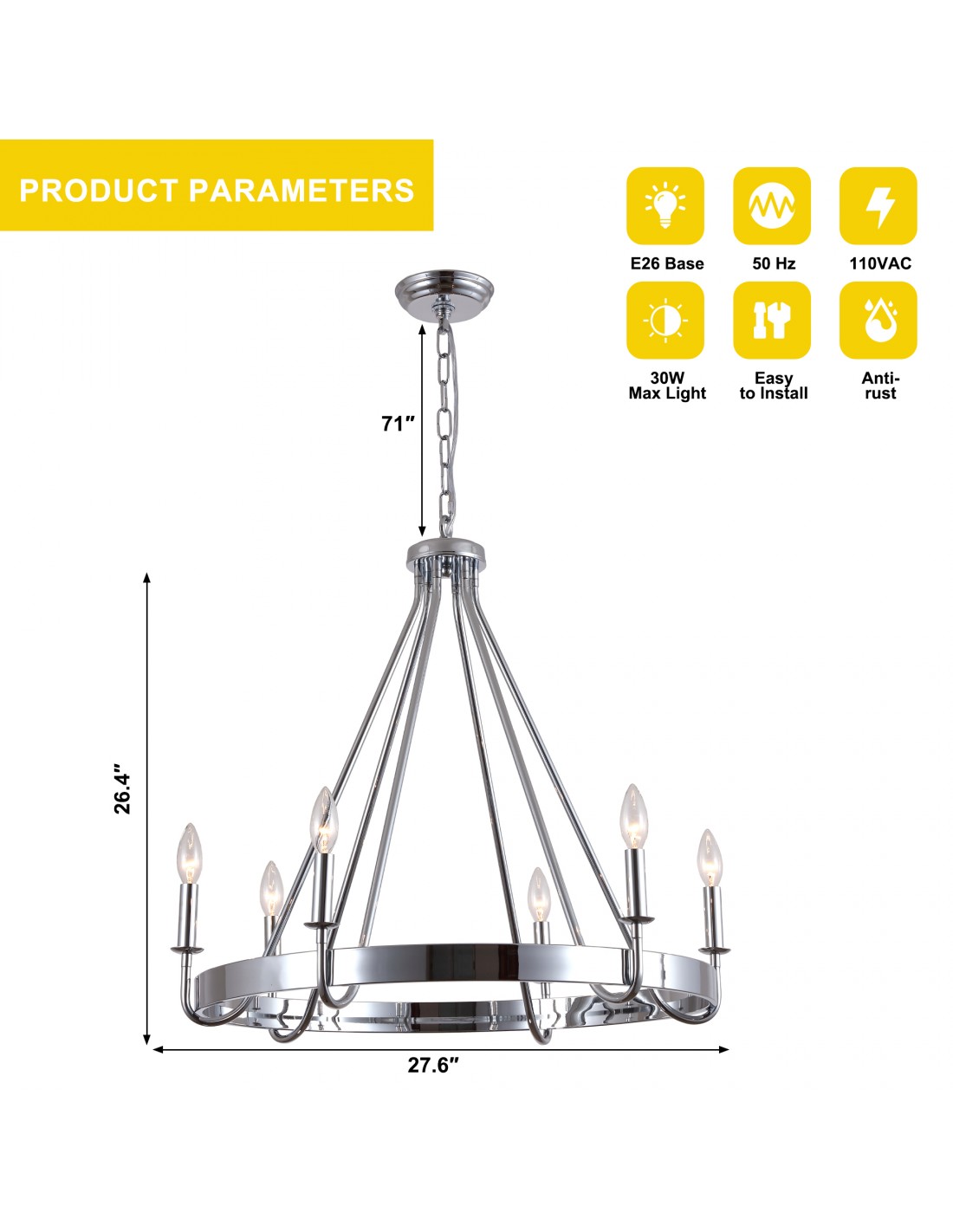 Add rustic industrial charm to your space with this 28-inch chrome wagon wheel chandelier. Crafted from high-quality iron with a durable baked paint finish, this statement piece features six classic candle-style sockets arranged on a distinctive wagon wheel design. The 71-inch adjustable chain allows flexible hanging length to suit various ceiling heights, allowing you to customize the height for perfect placement over your kitchen island, dining table, or entryway. Hardwired for reliable performance, it supports up to six E26 candelabra base bulbs (not included), compatible with LED, CFL, or incandescent bulbs for customizable ambiance.