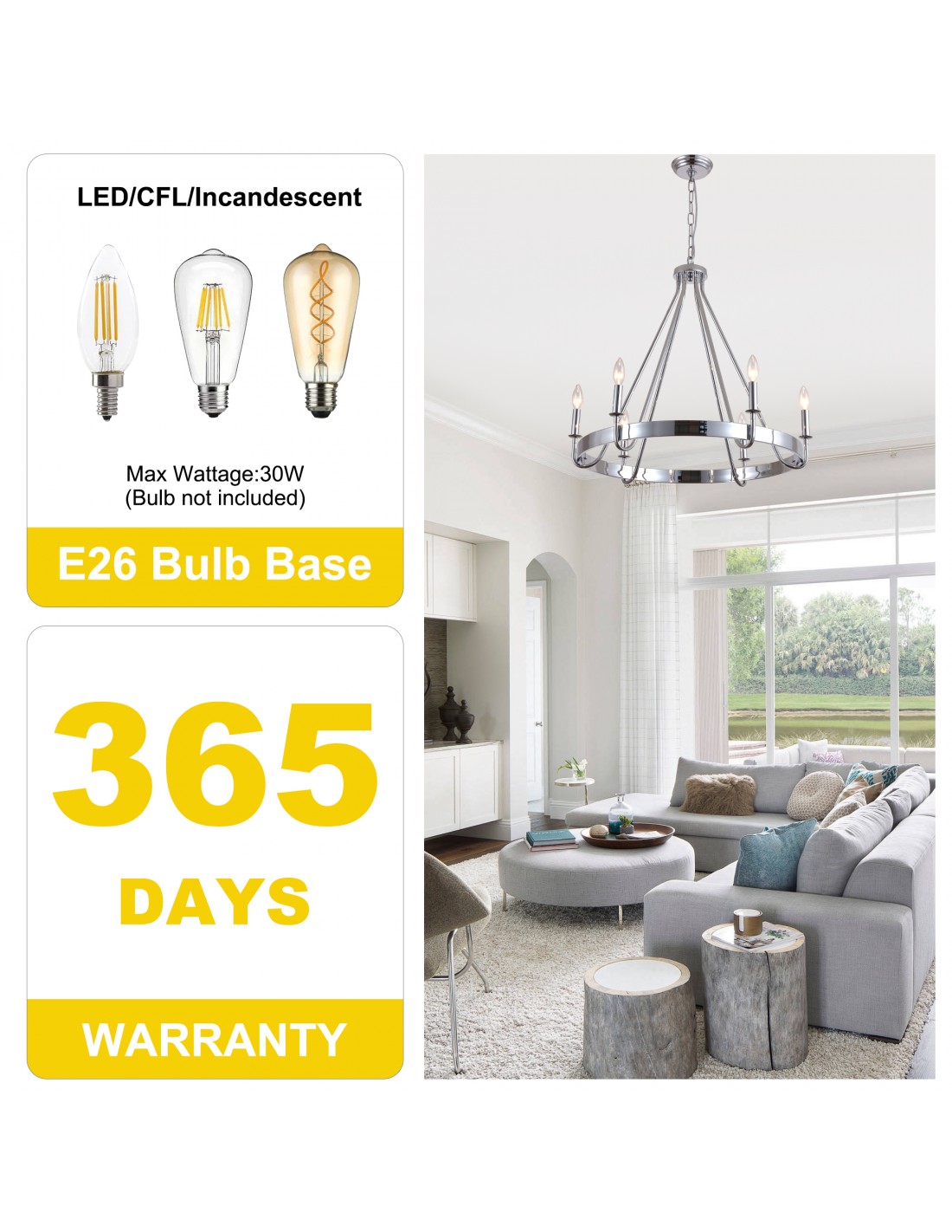 Six-Light Candle Configuration: Equipped with six E26 candelabra bulb sockets (bulbs not included), perfect for creating warm, ambient lighting.