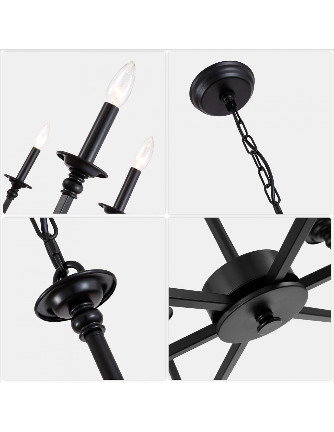 This 28-inch matte black wagon wheel chandelier combines industrial style with rustic charm, making it a perfect addition to your living room, dining area, bedroom, or entryway. Crafted from high-quality iron with a durable baked finish, it resists fading and wear over time. The 71-inch adjustable chain allows flexible hanging length to suit various ceiling heights. Accommodates six E12 base bulbs (not included), compatible with LED, energy-efficient, or incandescent bulbs for customizable lighting. Designed for sloped ceilings (up to 30 degrees) and features hardwired installation for easy setup.
