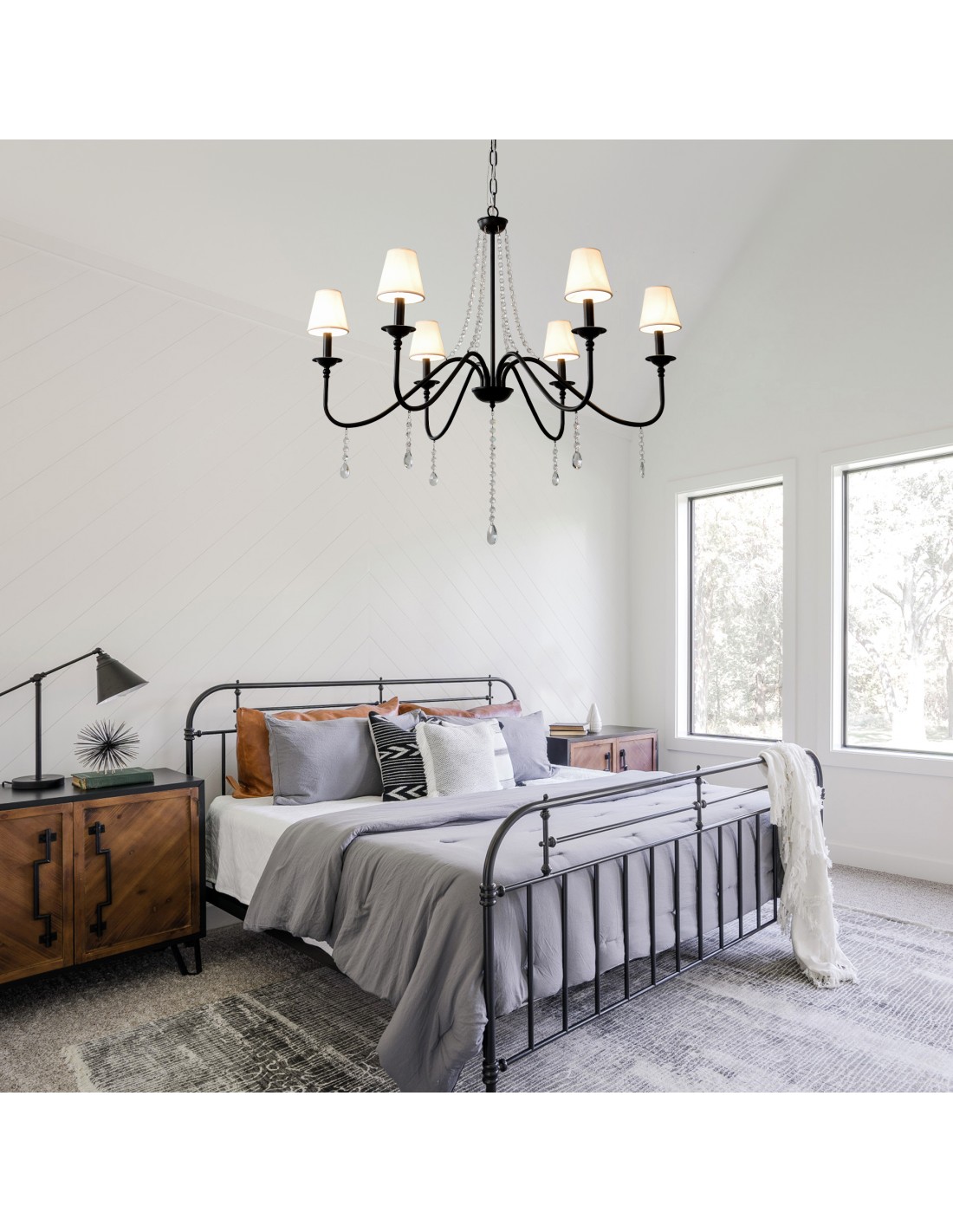 Elevate your space with this stunning 35-inch black chandelier, where industrial iron craftsmanship meets soft fabric shades and delicate crystal embellishments. Perfect for adding a touch of rustic elegance to your dining room, bedroom, or entryway, this fixture features a durable baked enamel finish. With its 71-inch adjustable chain, this fixture adapts to different ceiling heights while maintaining a balanced proportion in any room. Compatible with sloped ceilings (up to 30 degrees), it offers versatile installation options for both standard and uniquely angled spaces.The rustic yet refined design makes it an ideal centerpiece for various spaces: create a warm ambiance in your dining room, add character to your bedroom, make a statement in your foyer, or enhance the charm of your farmhouse-style kitchen.