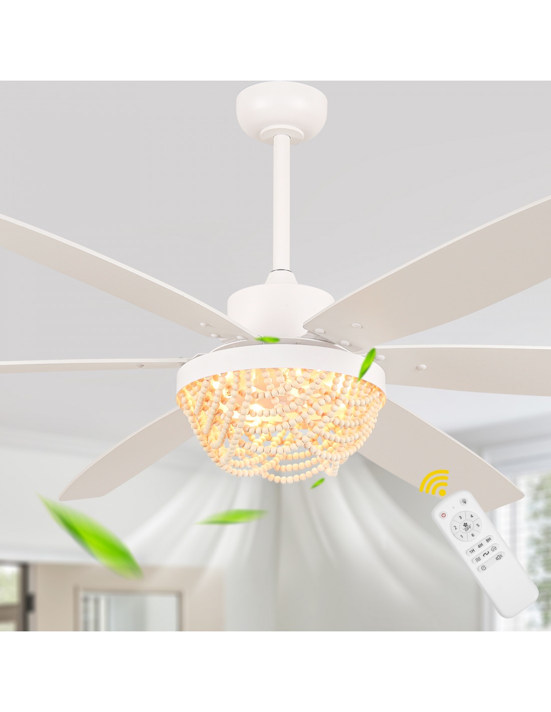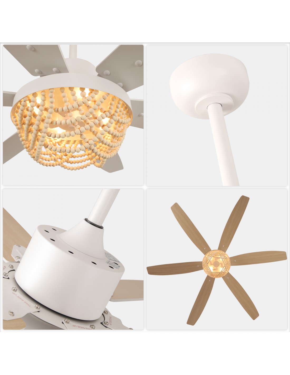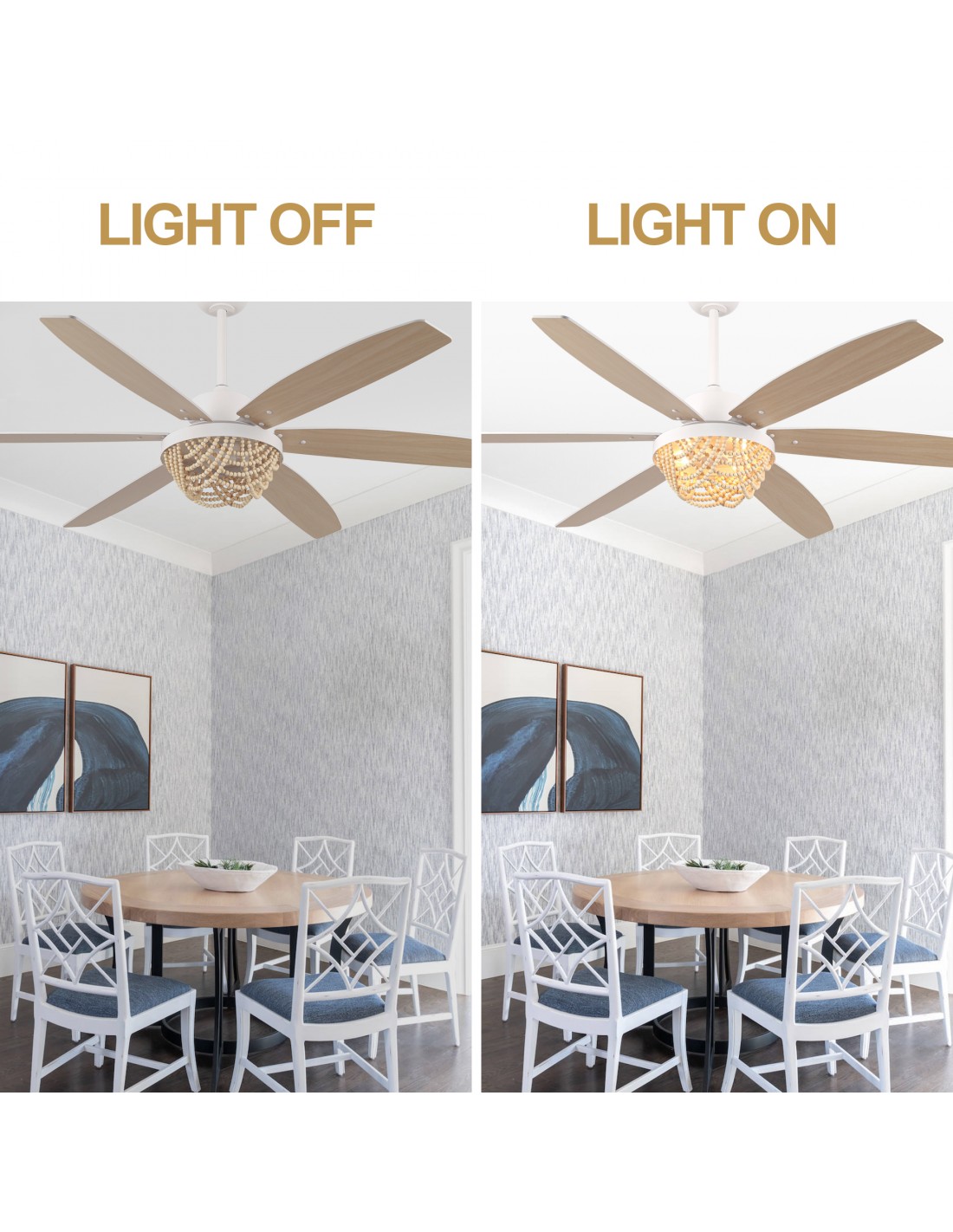 Bring a touch of free-spirited elegance to your space with this 65-inch bohemian-style ceiling fan. This stunning fixture features five reversible blades (white/light wood tone dual finishes) and a unique bottom shade made of cascading wooden beads, creating a perfect blend of rustic charm and artistic flair. Powered by an energy-efficient DC motor, it operates at near-silent noise levels while offering 6-speed settings and reversible rotation for year-round comfort - downdraft cooling in summer and updraft air circulation in winter. The included remote control allows you to conveniently adjust settings, including a programmable timer (1/4/8 hours). With four E12 sockets designed for Edison-style bulbs (bulbs not included), this fixture creates warm, ambient lighting that complements its boho aesthetic. The adjustable downrods (6" and 12" included) ensure perfect placement for various ceiling heights. Ideal for living rooms, bedrooms, sunrooms, or any space seeking bohemian-inspired comfort and style.