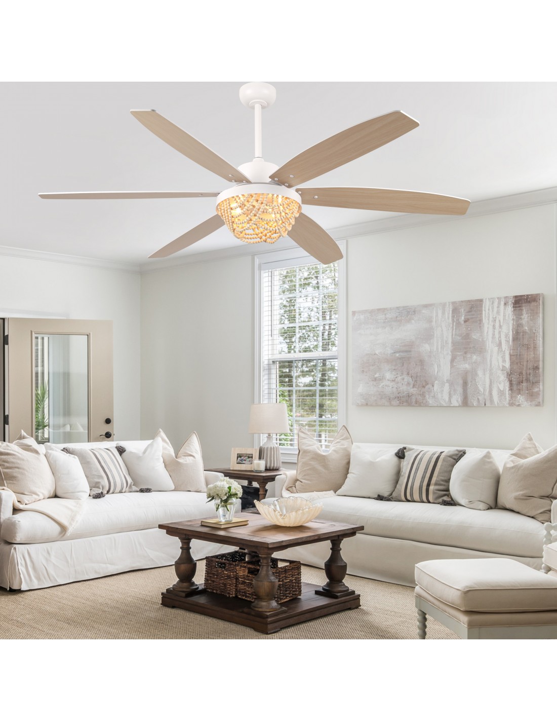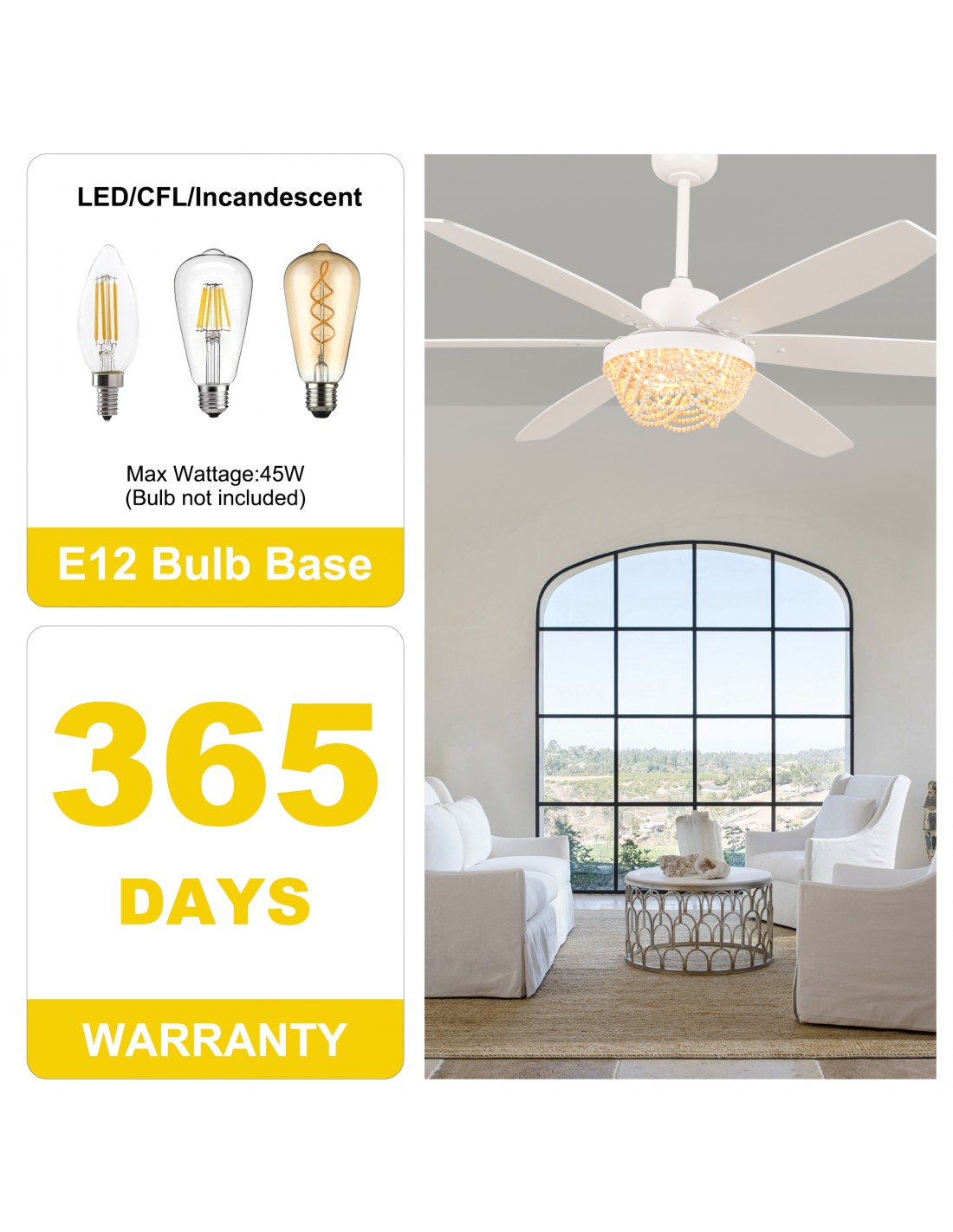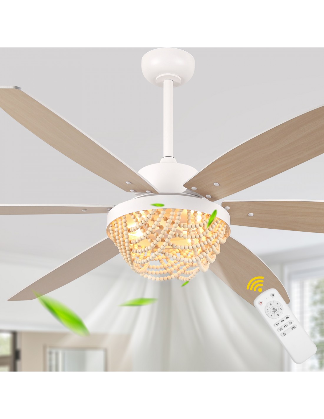 Bring a touch of free-spirited elegance to your space with this 65-inch bohemian-style ceiling fan. This stunning fixture features five reversible blades (white/light wood tone dual finishes) and a unique bottom shade made of cascading wooden beads, creating a perfect blend of rustic charm and artistic flair. Powered by an energy-efficient DC motor, it operates at near-silent noise levels while offering 6-speed settings and reversible rotation for year-round comfort - downdraft cooling in summer and updraft air circulation in winter. The included remote control allows you to conveniently adjust settings, including a programmable timer (1/4/8 hours). With four E12 sockets designed for Edison-style bulbs (bulbs not included), this fixture creates warm, ambient lighting that complements its boho aesthetic. The adjustable downrods (6" and 12" included) ensure perfect placement for various ceiling heights. Ideal for living rooms, bedrooms, sunrooms, or any space seeking bohemian-inspired comfort and style.