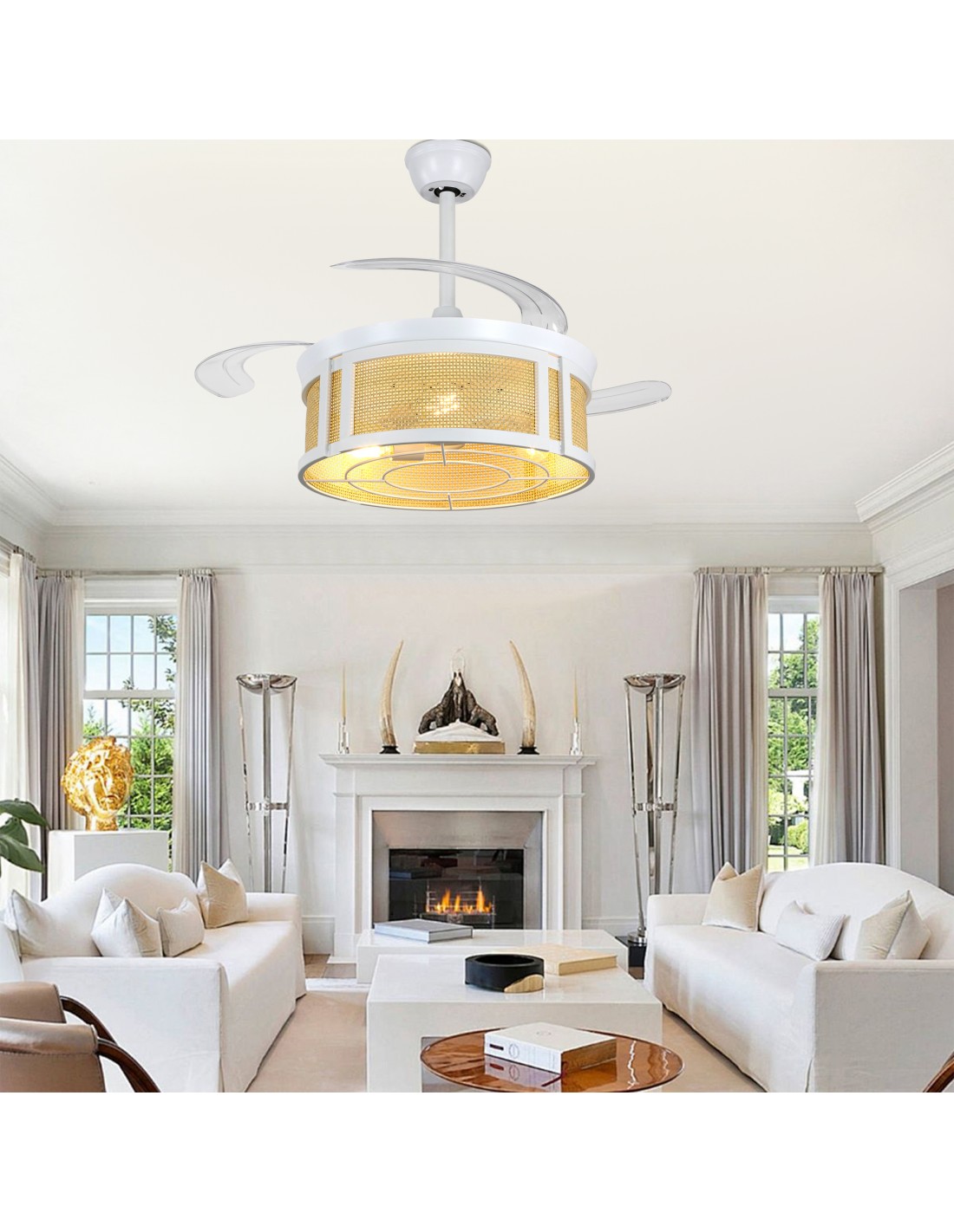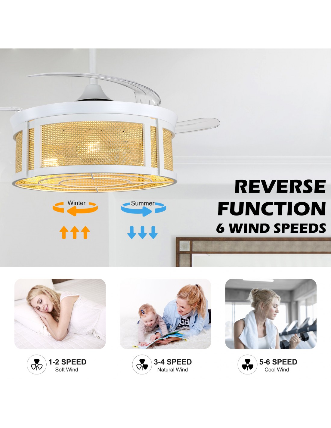 Upgrade your living room, bedroom, or sunroom with this 42" retractable ceiling fan light—featuring a sleek white metal frame, natural bamboo shade, and 3 transparent ABS retractable blades for modern, clutter-free style. Enjoy 6 adjustable wind speeds, a reversible motor for summer cooling/winter warmth, and 1/2/4-hour timing via the convenient remote. The included 4" and 12" downrods fit standard 8–10ft ceilings, while 3 E26 sockets (bulbs excluded) let you customize brightness. Ideal for seamless style and all-season comfort. Features: