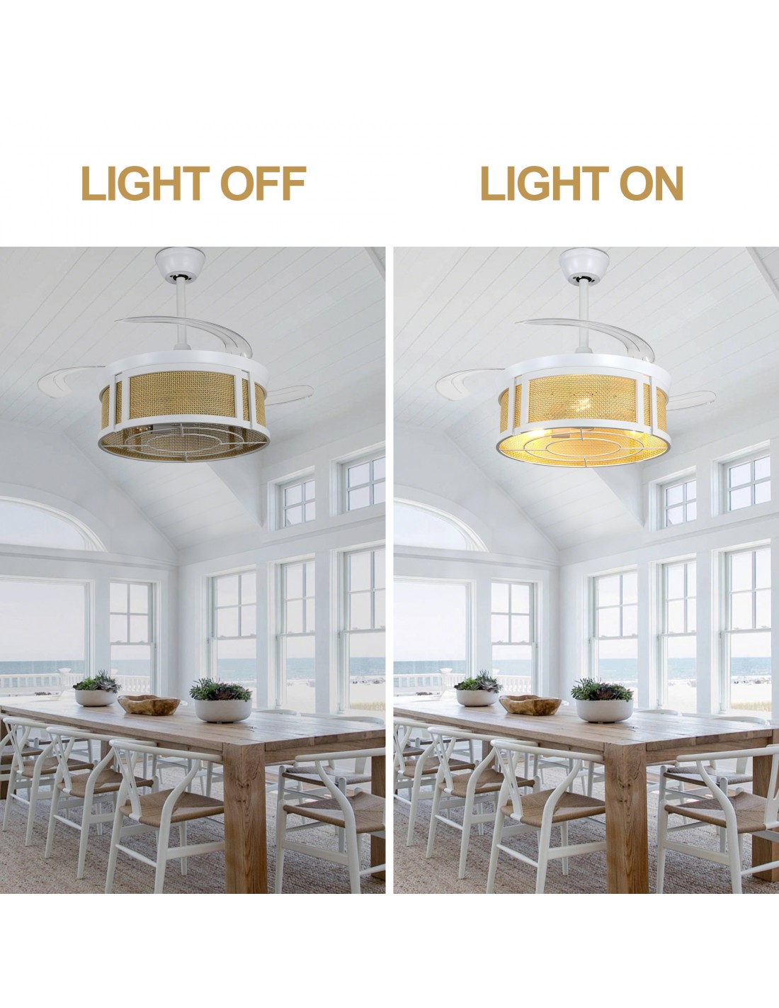 Modern Aesthetic with Natural Charm: This fan light features a sleek white metal frame paired with a bamboo natural shade, creating a harmonious mix of contemporary minimalism and rustic warmth. The 3 transparent ABS retractable blades stay hidden when not in use, maintaining a clean, uncluttered look for your space—perfect for modern, bohemian, or coastal-inspired interiors.