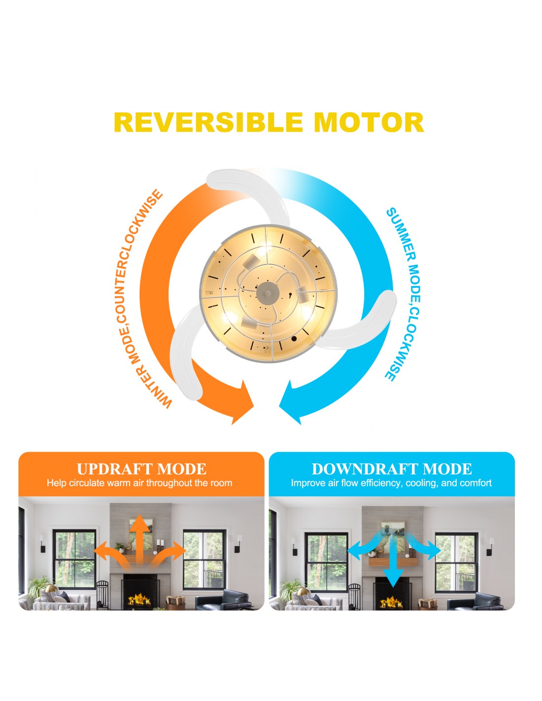 Reversible Motor: Downward airflow for cooling in summer, upward airflow for circulating warm air in winter—reduces energy consumption for heating and cooling, saves money on utility bills.