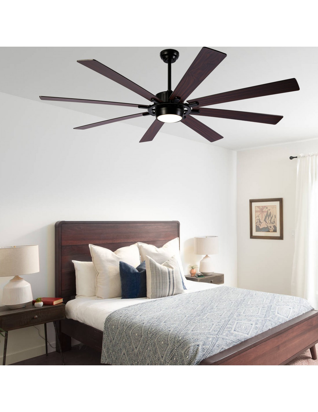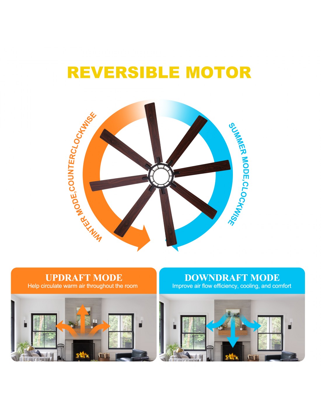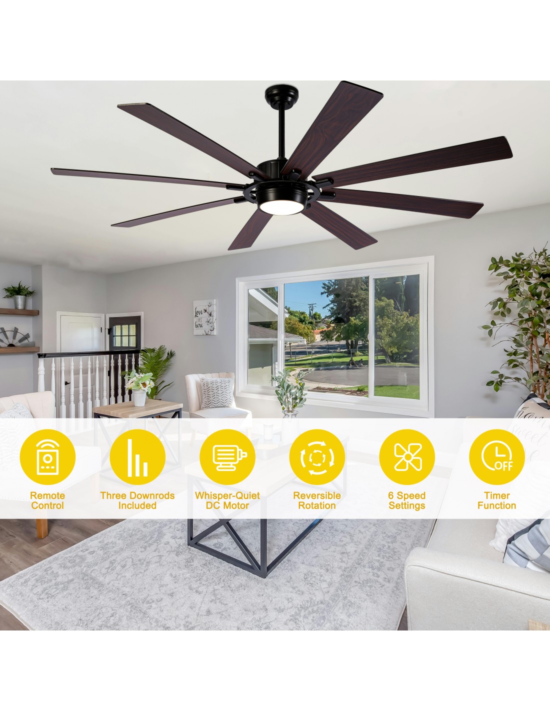 Elevate your large living space with our premium 72-inch ceiling fan, engineered for grand rooms, great rooms, and commercial-grade indoor areas up to 400+ sq. ft. Combining industrial robustness with modern convenience, this fan features 8 double-sided blades (deep brown/light brown) and a sleek matte black finish, delivering powerful airflow and customizable illumination to suit any mood or task. The inclusion of three adjustable downrods ensures perfect installation for high or sloped ceilings.