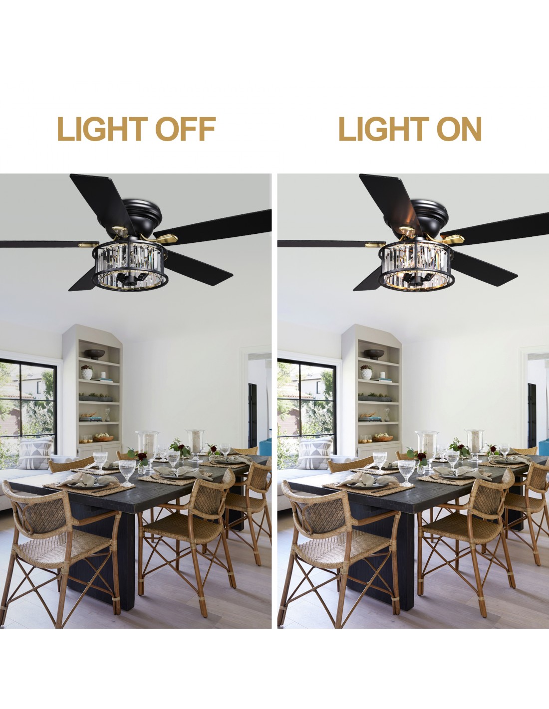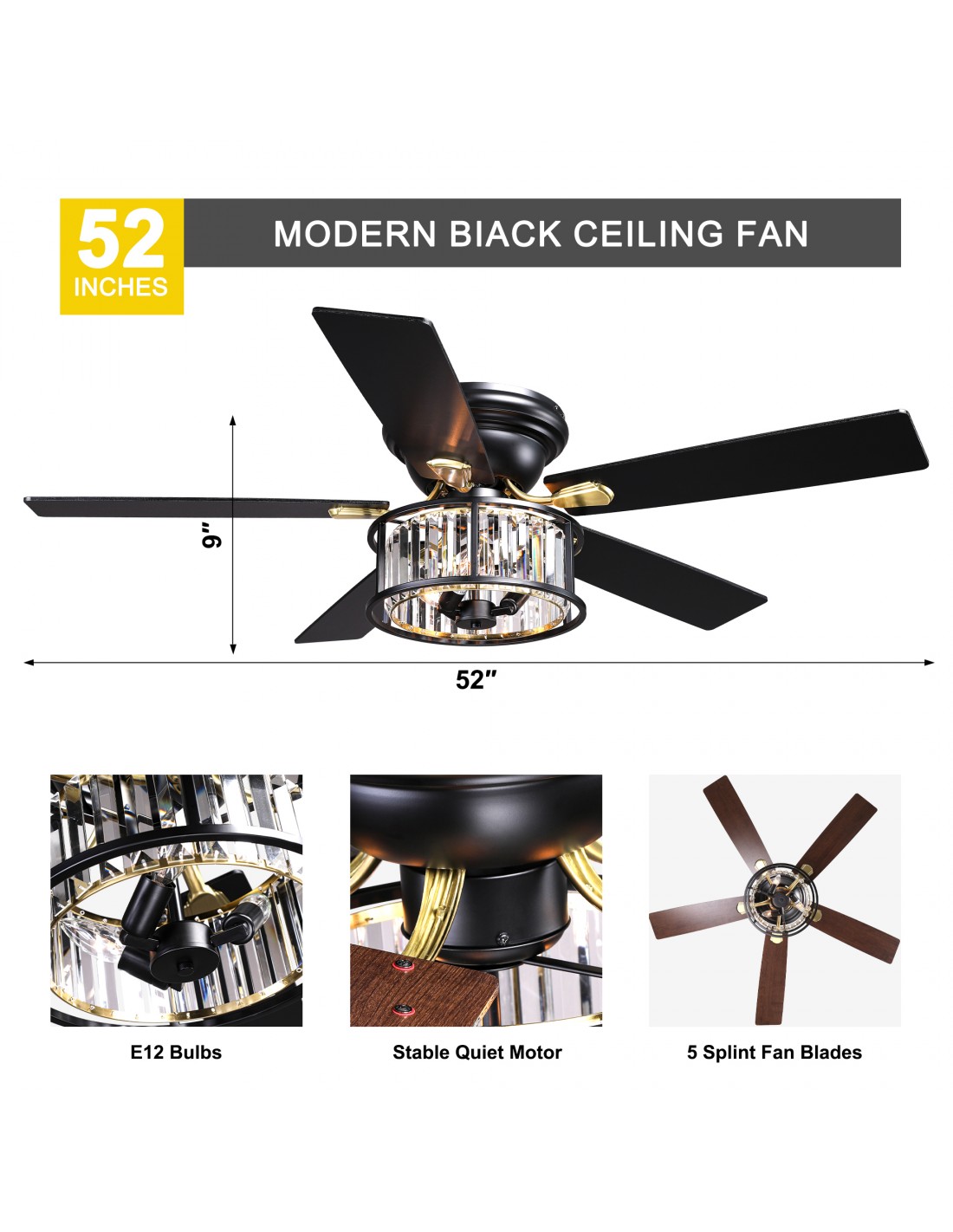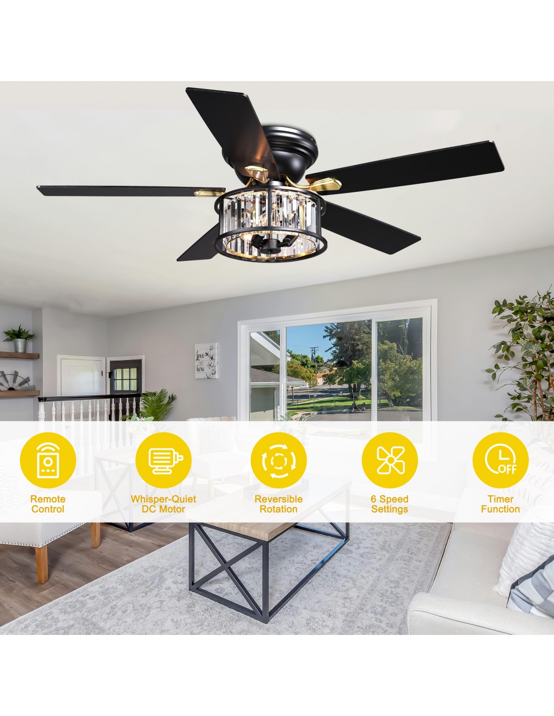 Elevate your home decor with this stunning 52-inch crystal ceiling fan, blending modern elegance and functional performance. The black metal frame is adorned with shimmering clear crystal accents, creating a glamorous focal point for any living room, bedroom, or dining area. Beyond its aesthetic appeal, this fan is engineered for year-round comfort powered by a quiet and efficient DC motor. Enjoy personalized airflow with 6 different speed settings, and never get out of bed again to turn off the fan thanks to the included remote control.