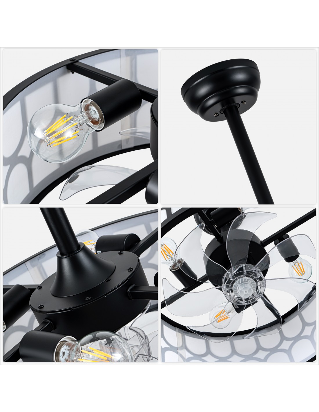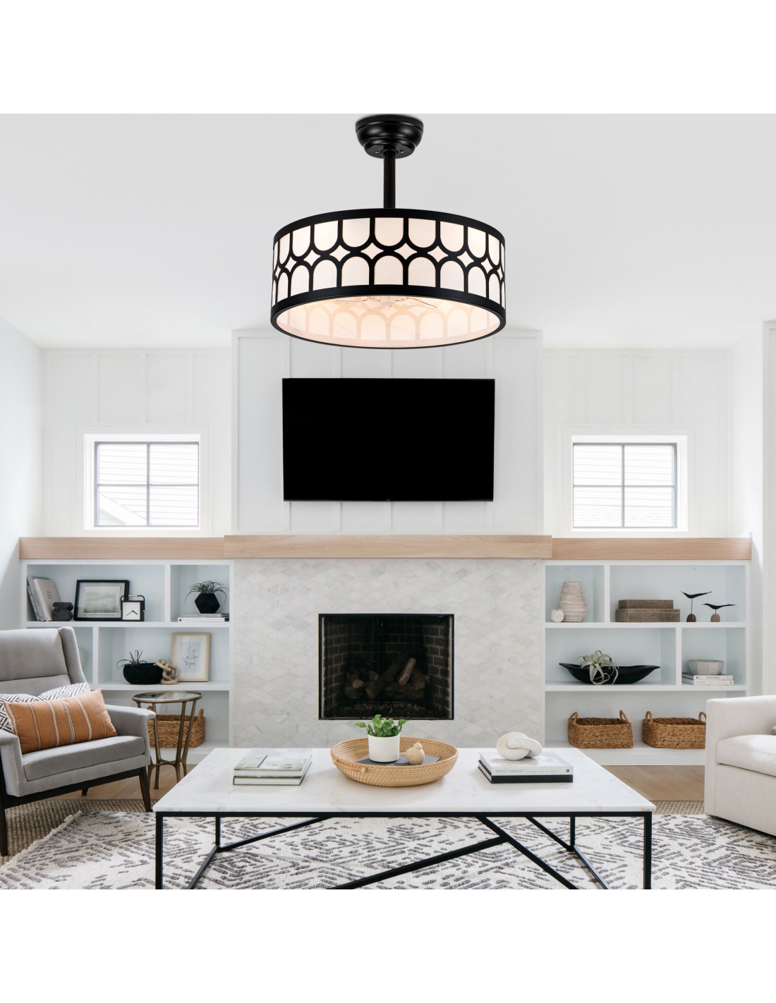 Elegant Caged Design with Premium Materials: Matte black metal frame features a sophisticated geometric cutout pattern, paired with a soft beige parchment drum shade for a warm, inviting glow. Hidden transparent ABS fan blades maintain a sleek, uncluttered look when not in use, blending seamlessly with modern, industrial, and transitional decor styles.