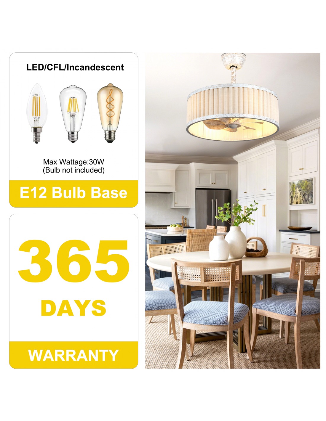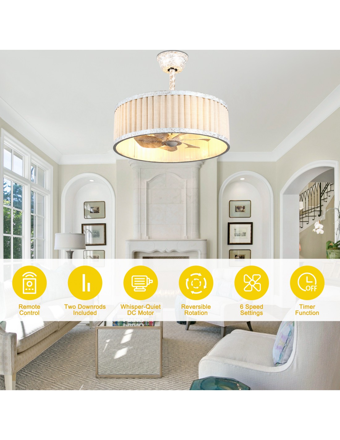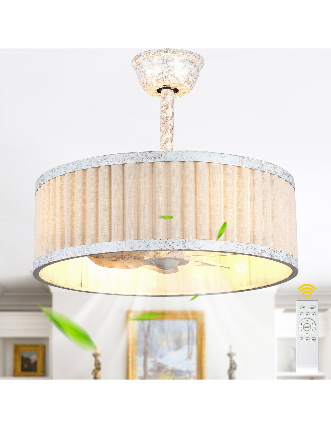 Bring cozy, timeless style to your home with this 20" farmhouse ceiling fan. Its hand-distressed white iron frame and crisp white fabric drum shade evoke the warmth of a countryside cottage, while the hidden transparent ABS fan blades deliver powerful, quiet airflow. With 6 speeds, reversible airflow, dimmable lighting, and a full-function remote, you have complete control over your comfort year-round. The included 4" and 8" downrods ensure a perfect fit for any ceiling height, and the energy-efficient DC motor keeps your space comfortable while saving on energy bills. Ideal for living rooms, bedrooms, kitchens, and dining areas.